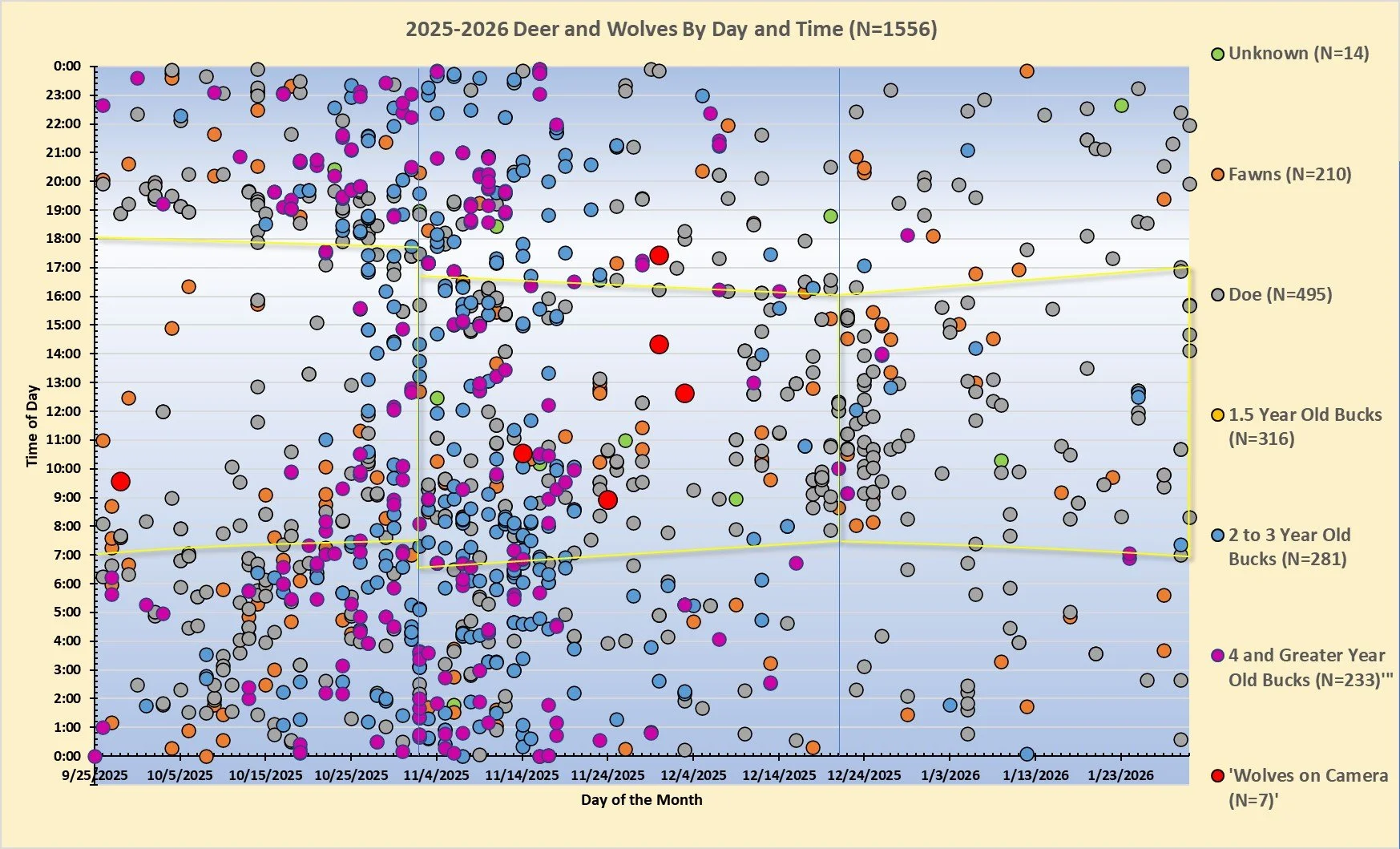 From our trail camera study we have recorded the date and time of every deer and wolf past the cameras between the end of September and the end of January since 2019. We have subjectively broken the deer past the camera into the following categories. Unknown, these are blurred images because of the speed of the animal, frost or moisture on the lense, or only a partial body in the image where sex and age can not be determined. The fawns and doe determination are self explanatory. We have broken bucks into 1.5 year olds (button bucks, spikes, and young forked horns), 2 to 3 year olds (determined by a combination of body size and antler configuration), and 4 year old and greater (determined by body size and antler configuration, these are the “tanks”). We have also recorded wolves past the cameras.